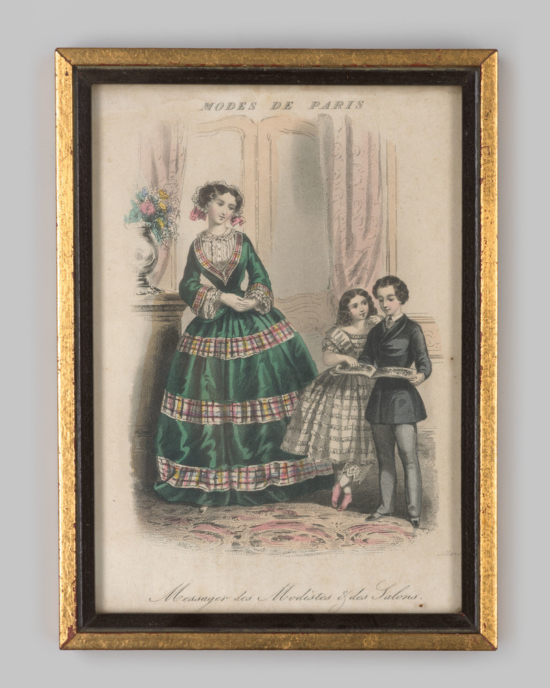 Modeprent met vrouw en kinderen in een interieur
