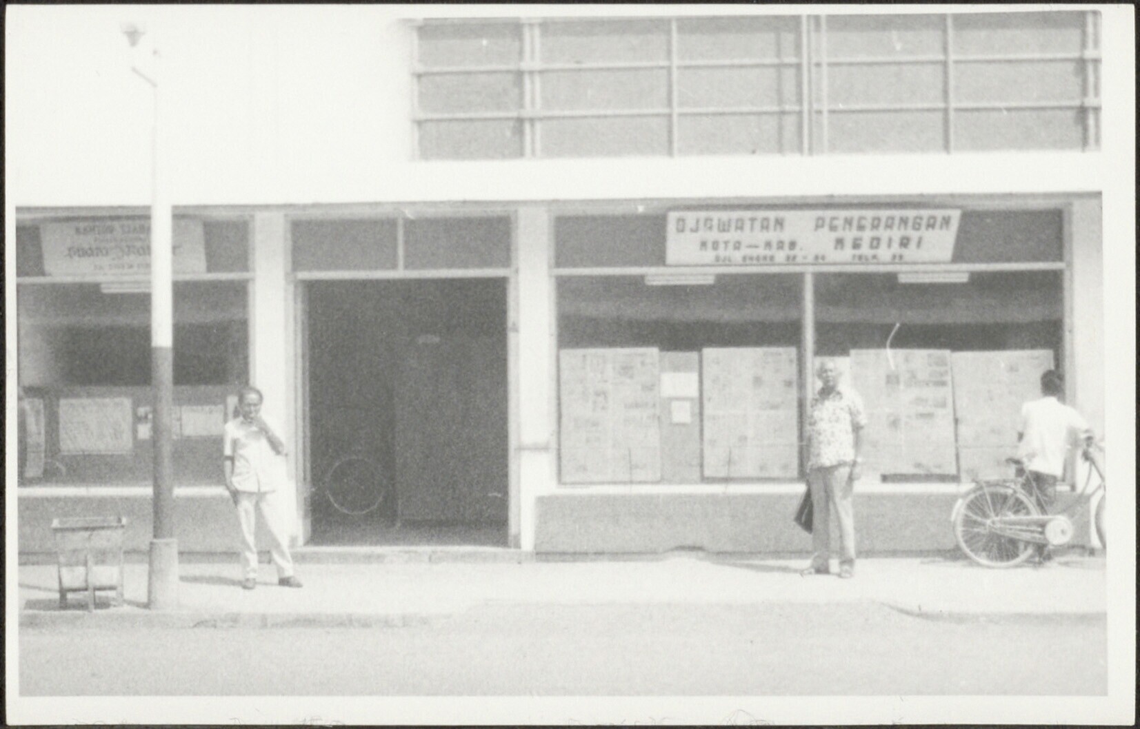 Straat met mannen, waarvan één met een fiets