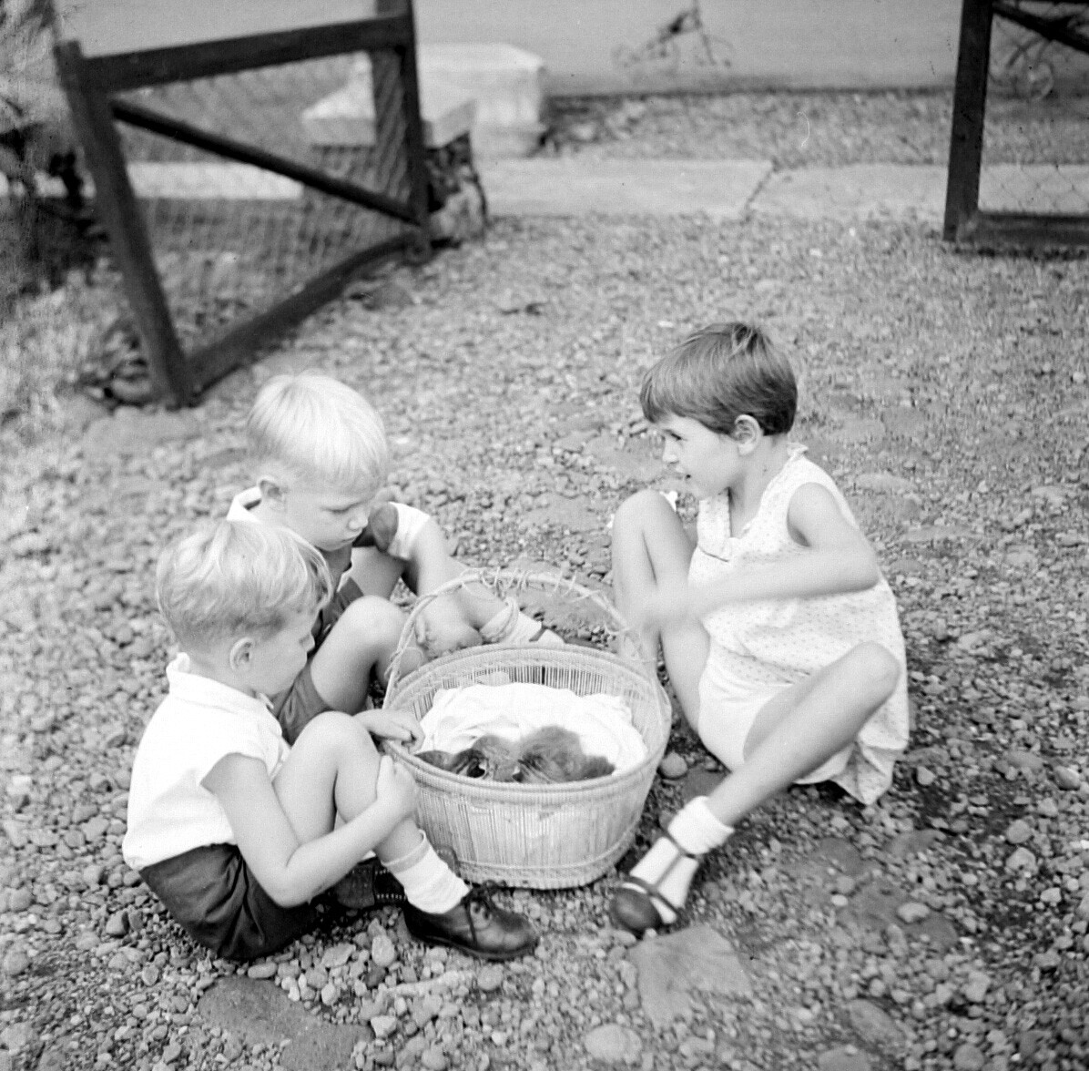 Kinderen bij een mand met jonge poesjes, Malang