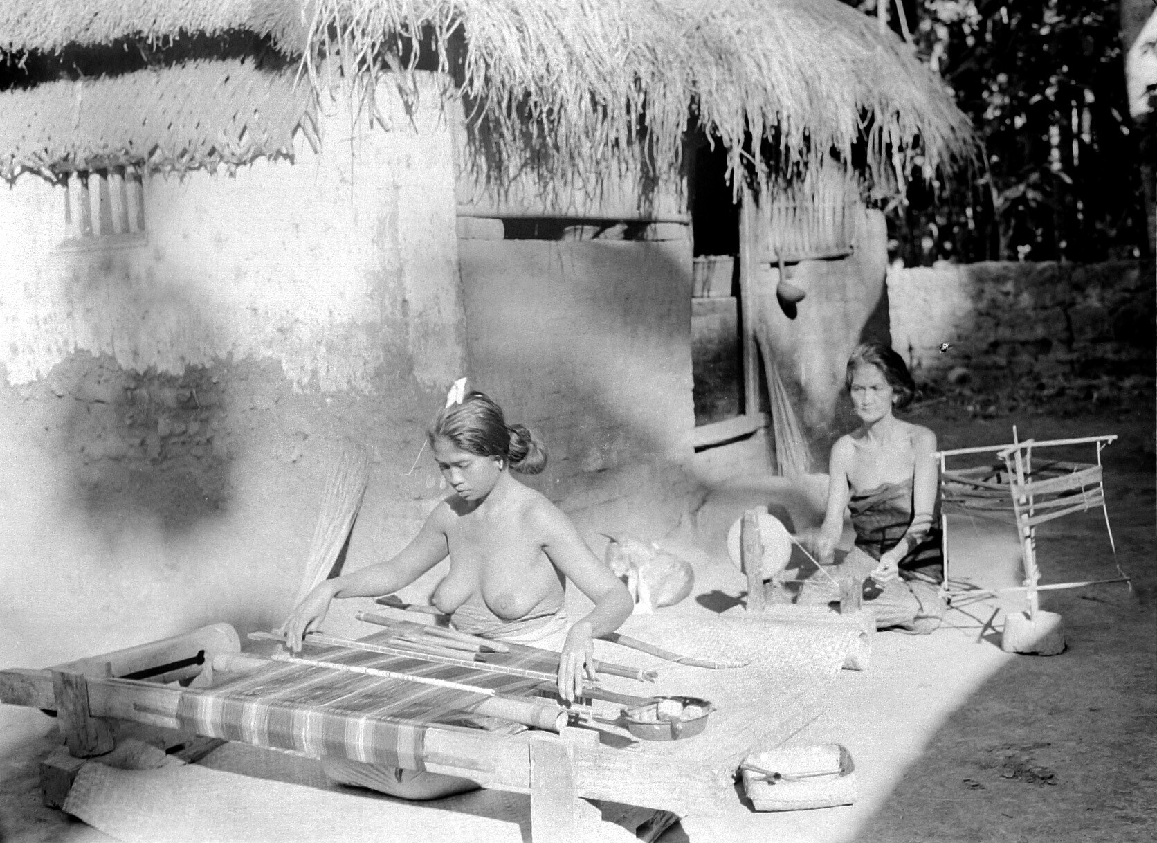 Balinese vrouwen met weefgetouw en haspel