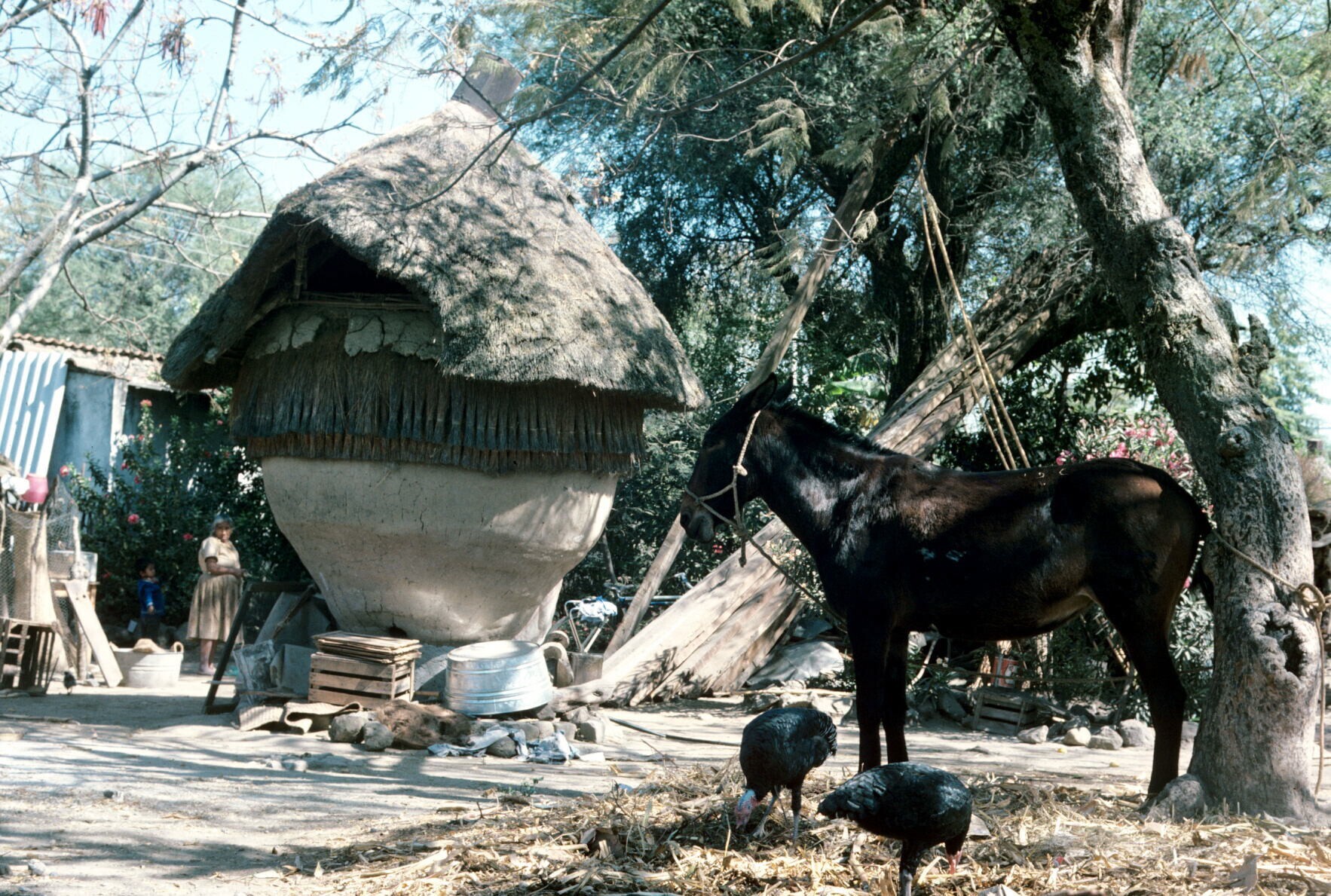 muildier en kalkoenen bij cuezcomate (maïsopslagplaats)
