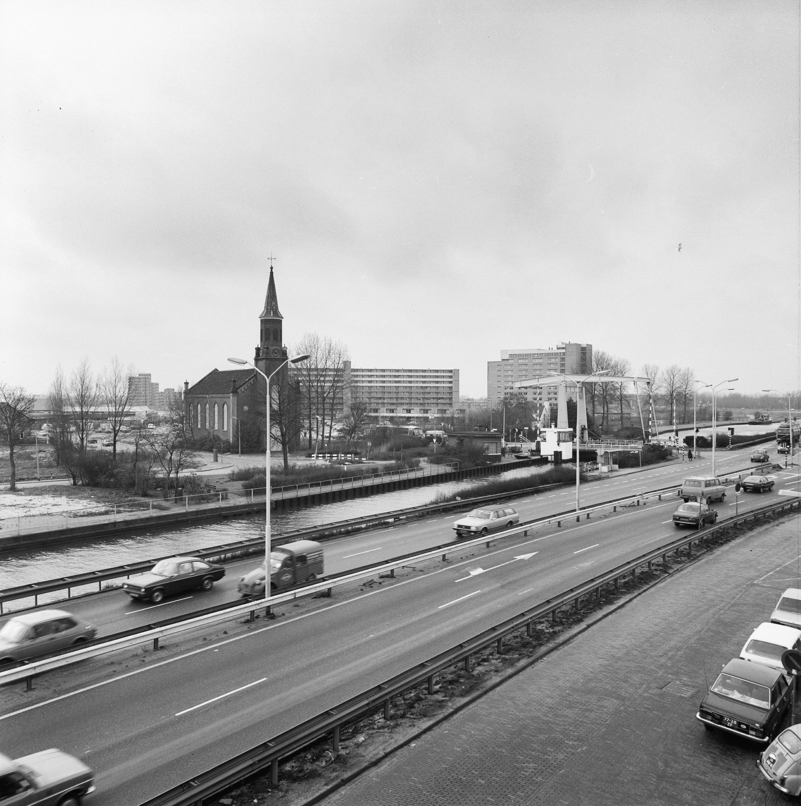 Overzicht verkeersweg met links de Hervormde kerk va...