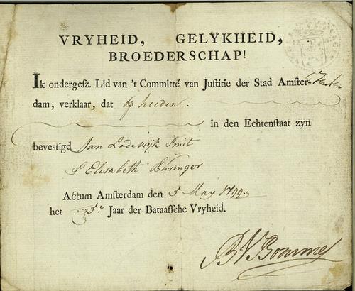 Huwelijksakte met klein zegel, 1799