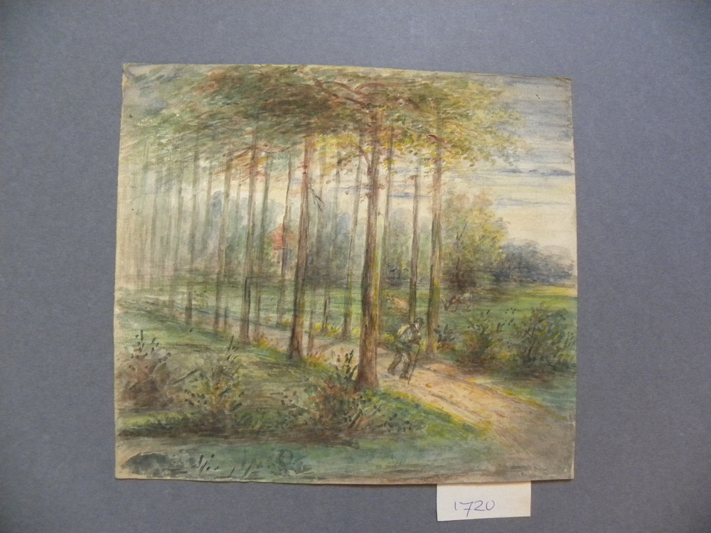 Aquarel voorstellende weg met bomen en man, ca. 1870.