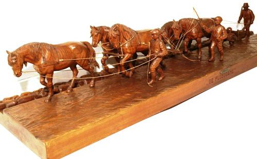 Beeld van hout van vijf paarden voor een ploeg, geti...