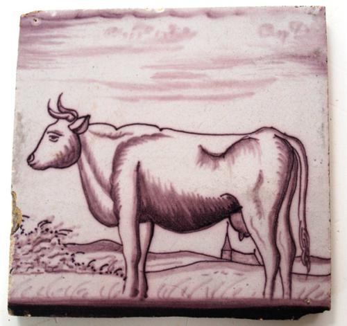 Tegel van aardewerk met een decoratie van een koe ge...