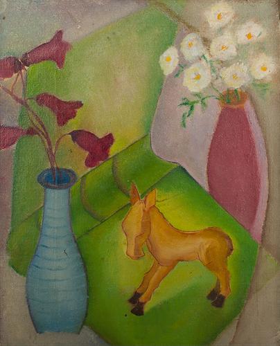 stilleven met bloemen in vaas en een rood paardje