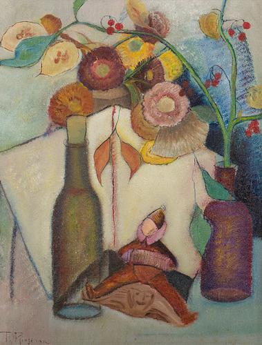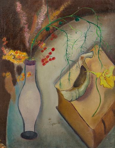 Stilleven met bloemen in vaas en harmonicaspeler