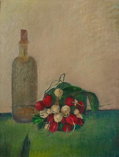 Stilleven met flesje en bosje radijs