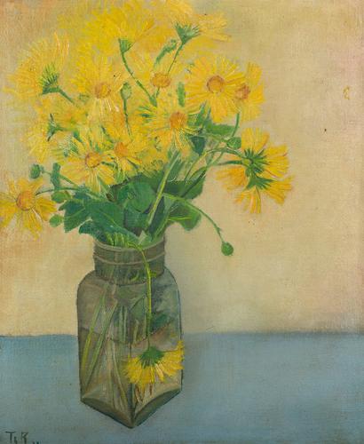 Stilleven met gele bloemen en pot