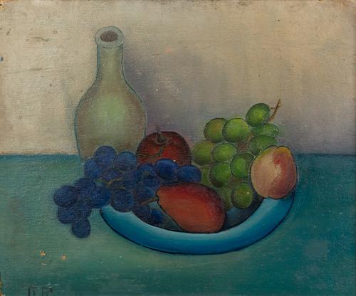 Stilleven met fruitschaal en fles