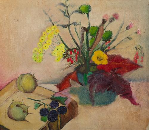 Stilleven met bloemen, boek, bramen en kastanjes