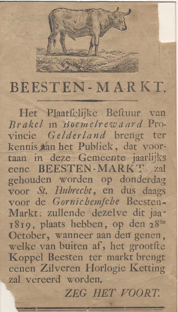 Affiche beestenmarkt, Brakel 1819. Druk: J. Noman.