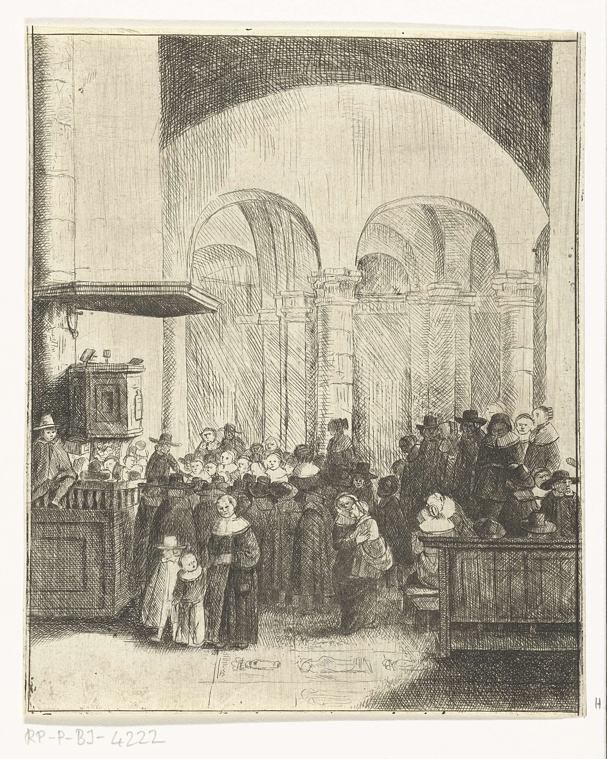 Kerkinterieur met kerkgangers