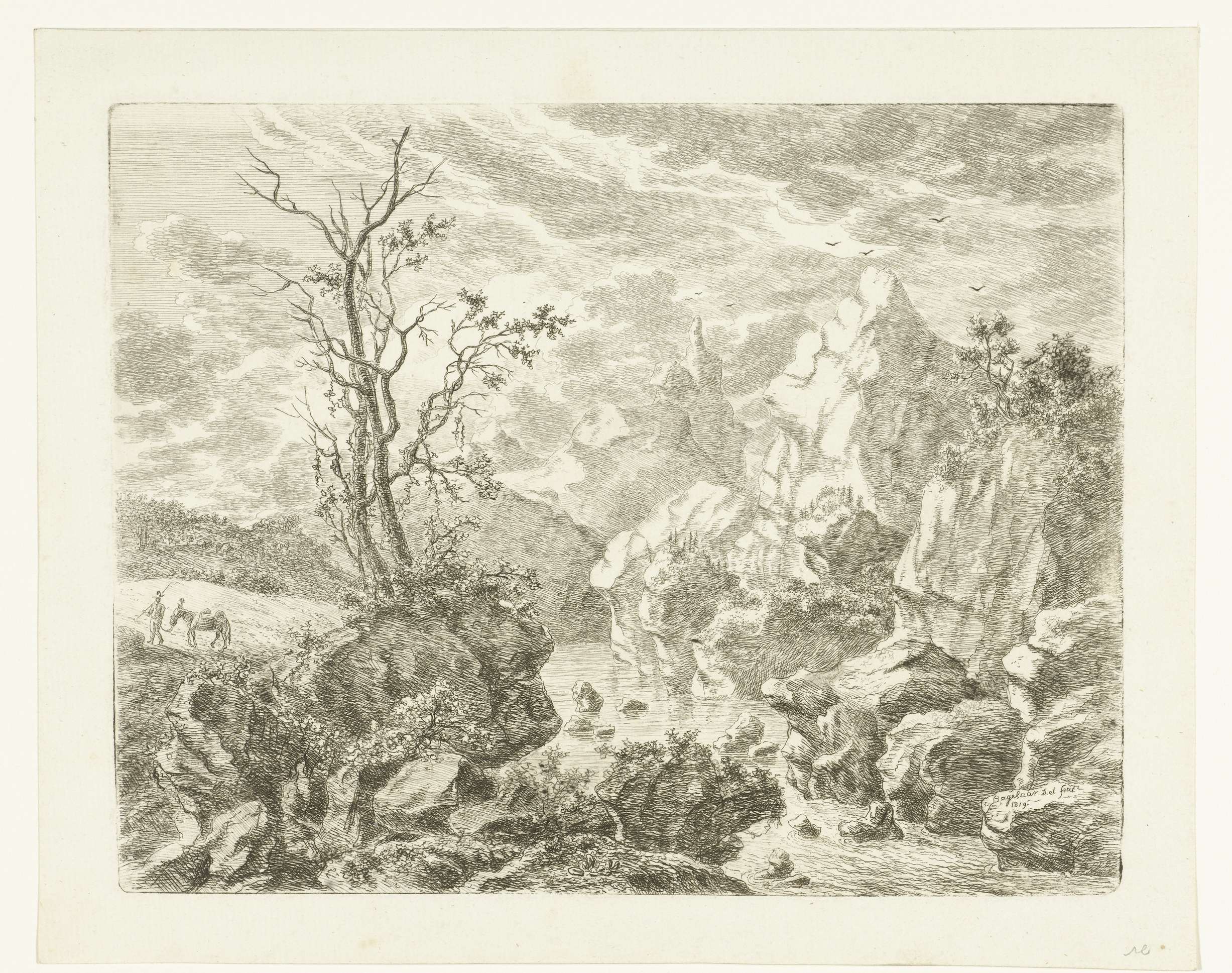 Landschap met hond en man die een takkenbos draagt