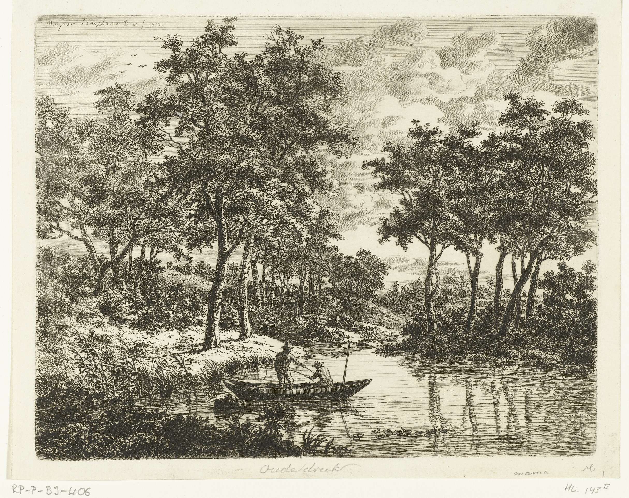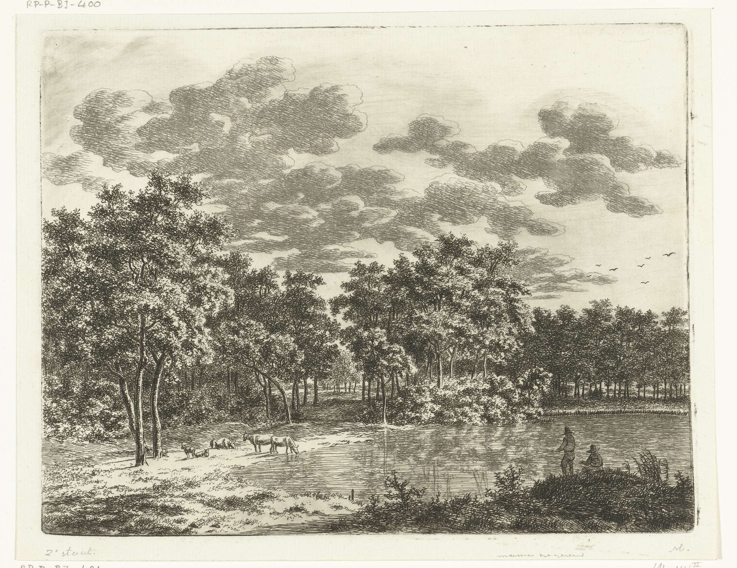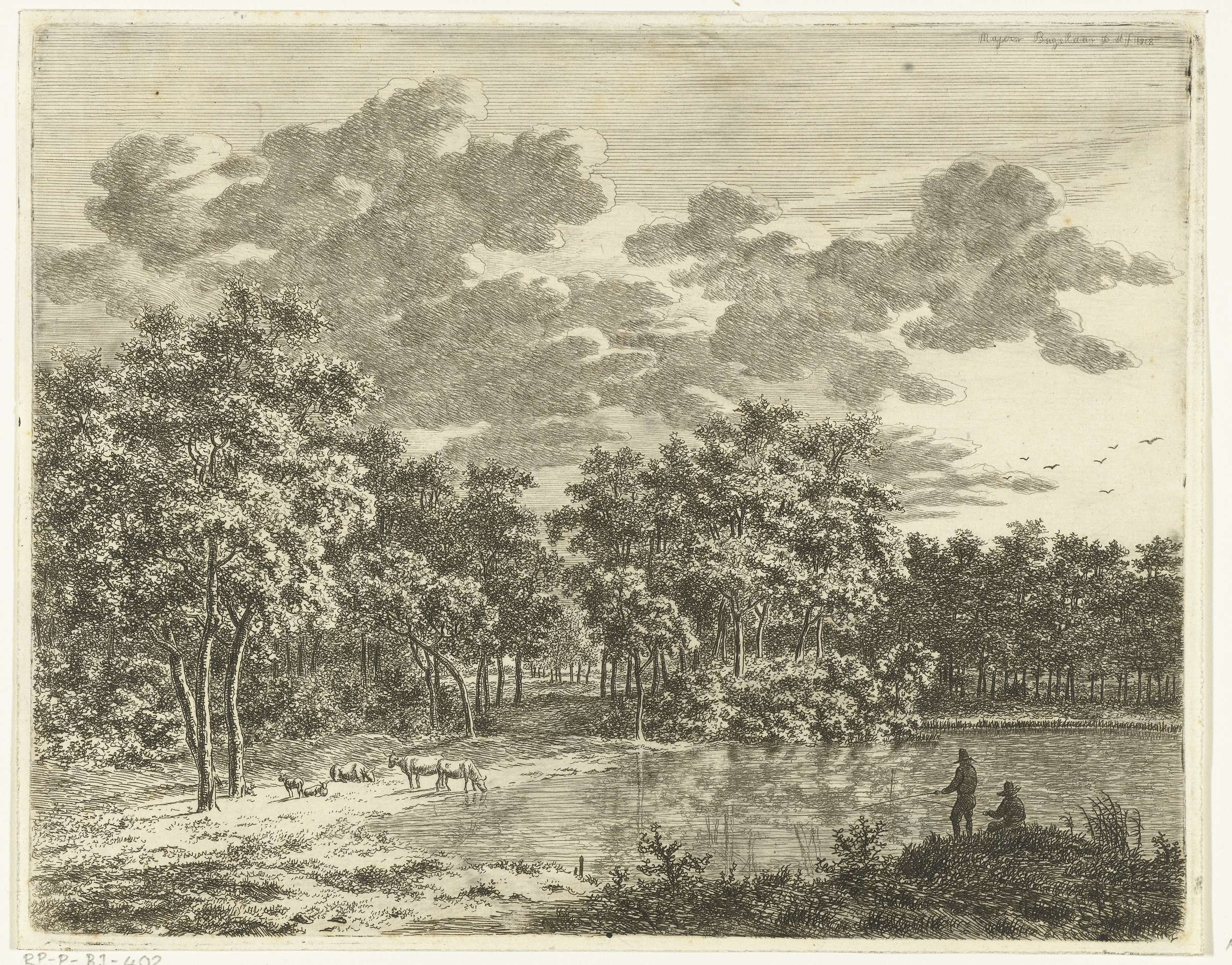 Landschap met vijver en twee hengelende vissers