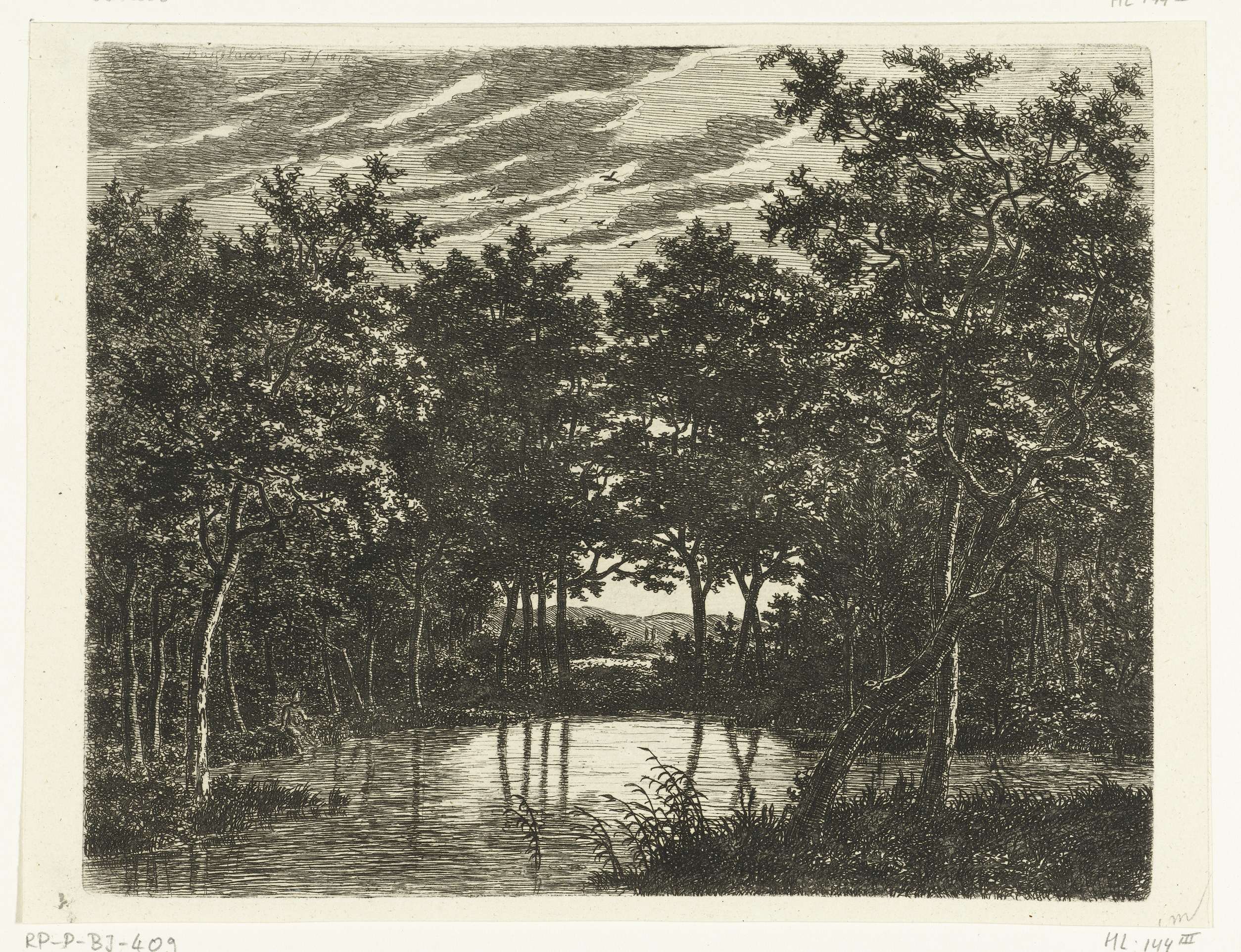 Landschap met vijver, links zit een visser met een p...
