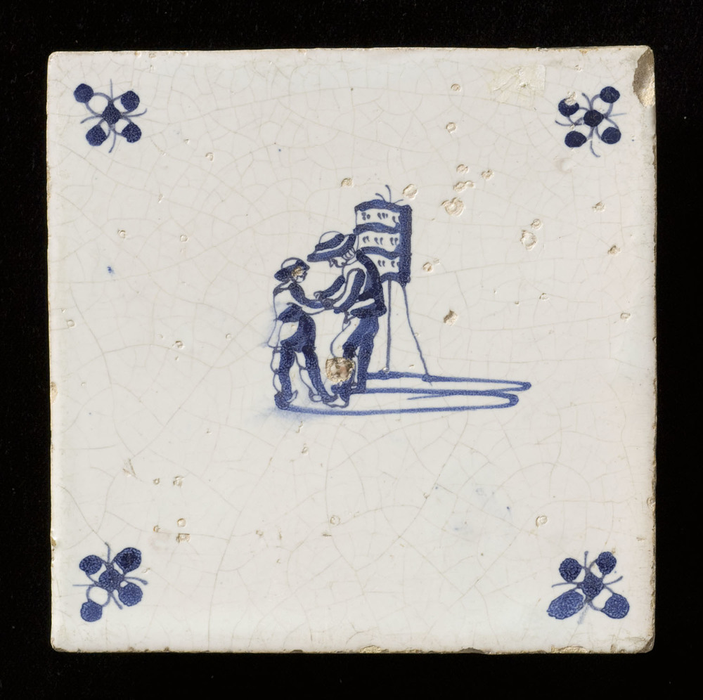 Tegel in tinglazuur, voorstellende prentenstalletje,...