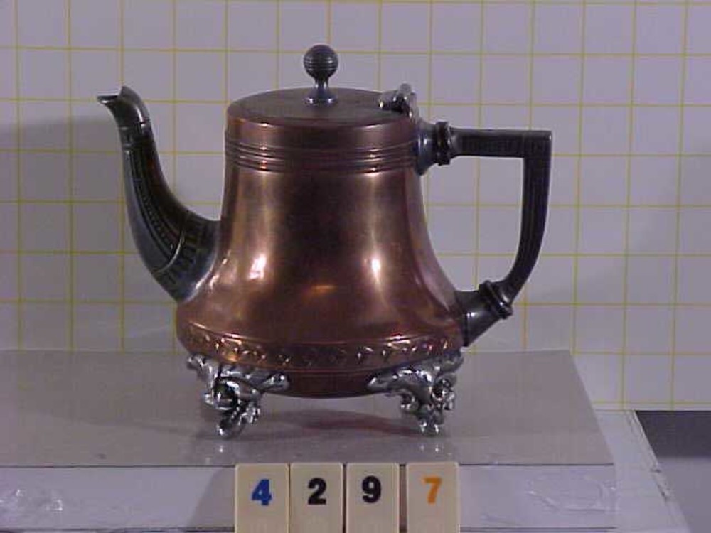 Theepot van messing, alboïd en rood koper, vervaardi...