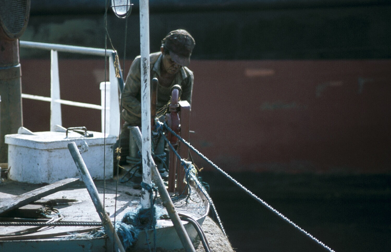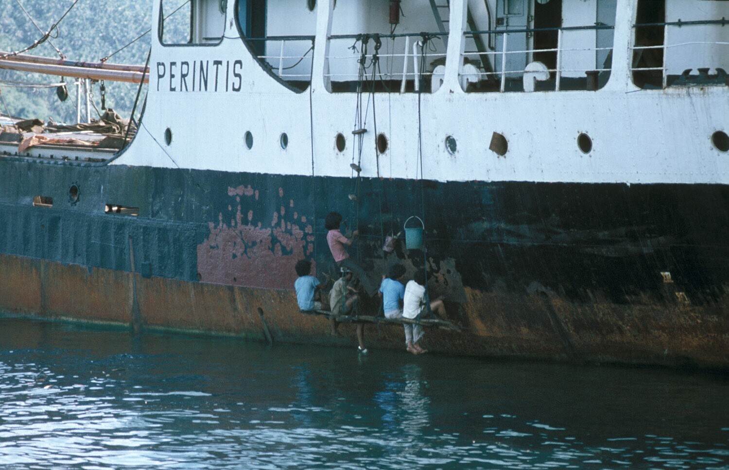 Werkzaamheden aan boord in de haven van Bitung, Sula...