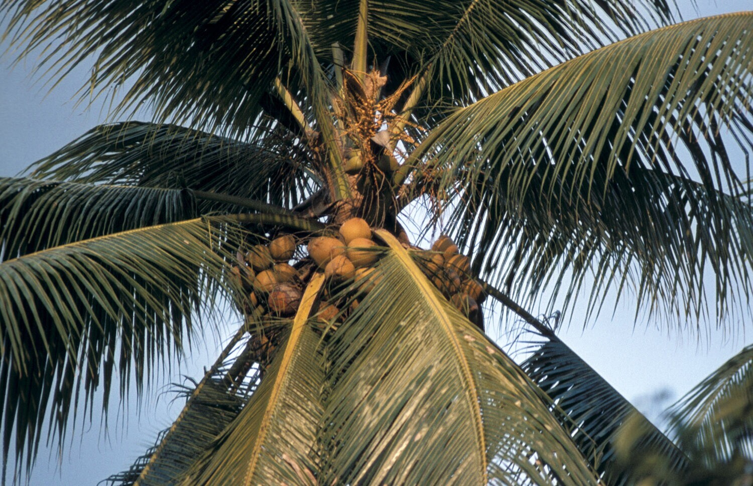 Detail van de kruin van een cocospalm op het strand ...