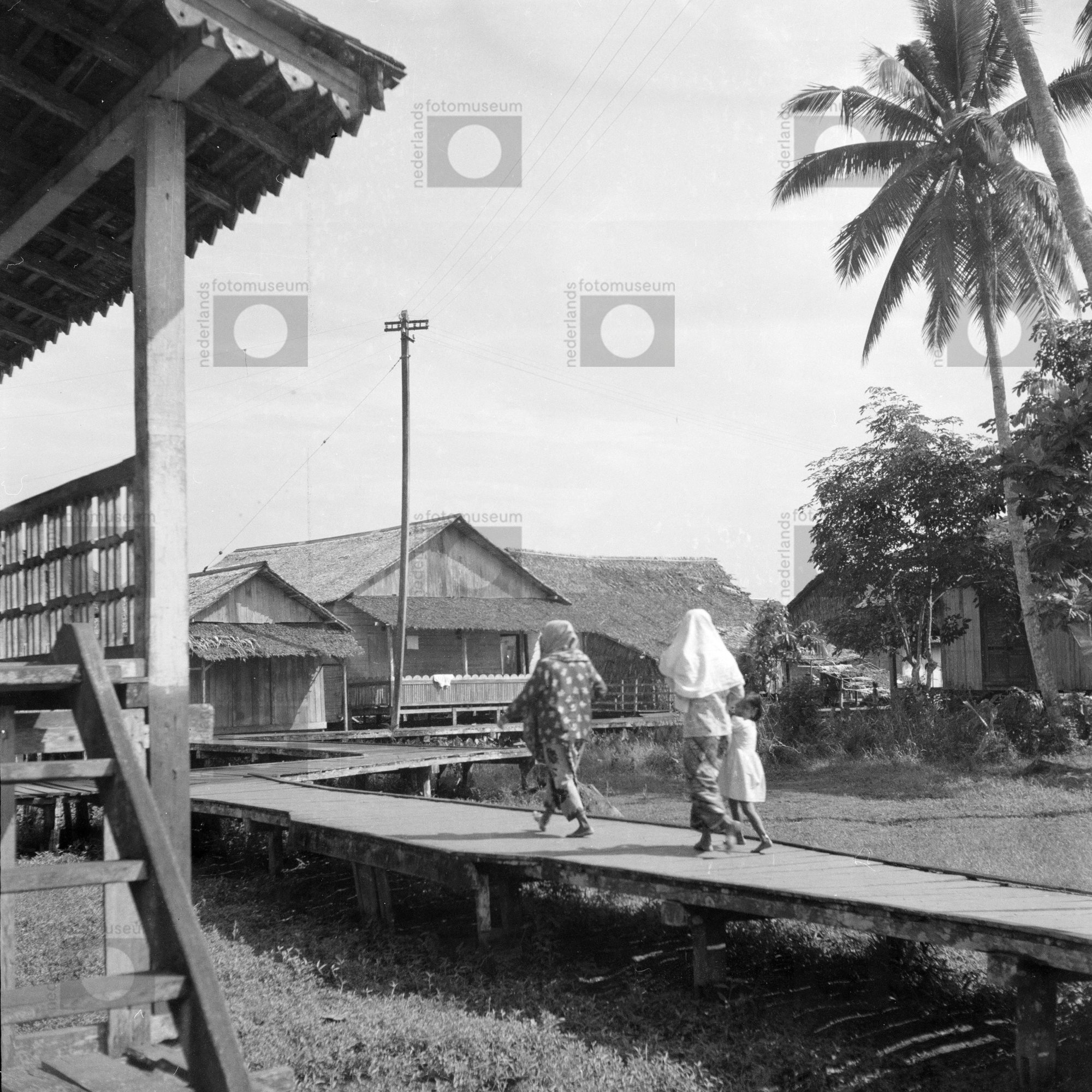 Loopbrug tussen paalwoningen door in Pontianak op Bo...