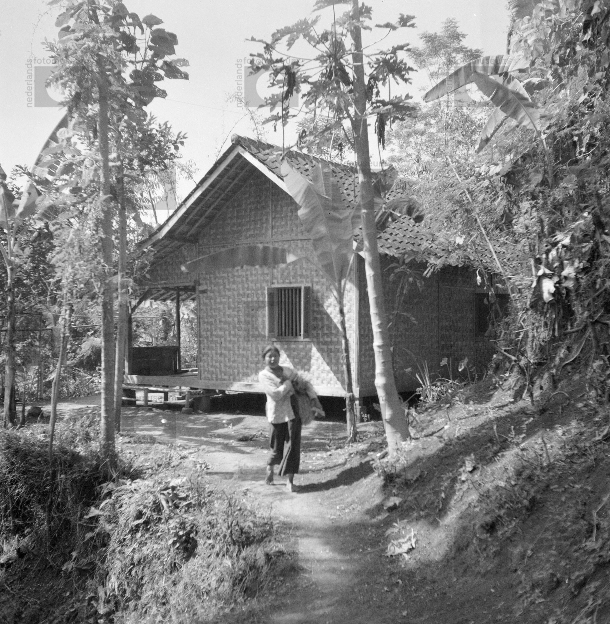 Een vrouw loopt op een dorpsweg vóór een inheemse wo...
