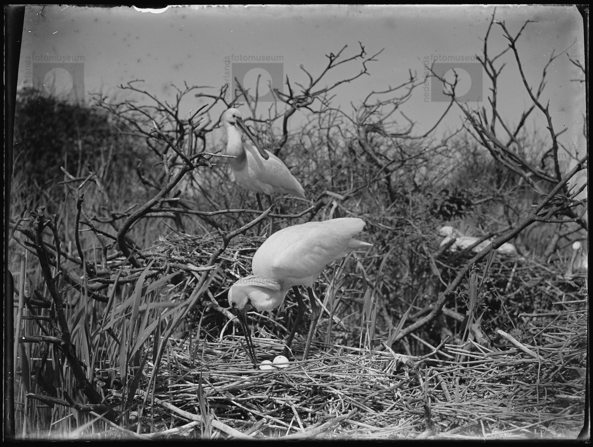Houtduif bij nest met jongen, Wanneperveen (1932)