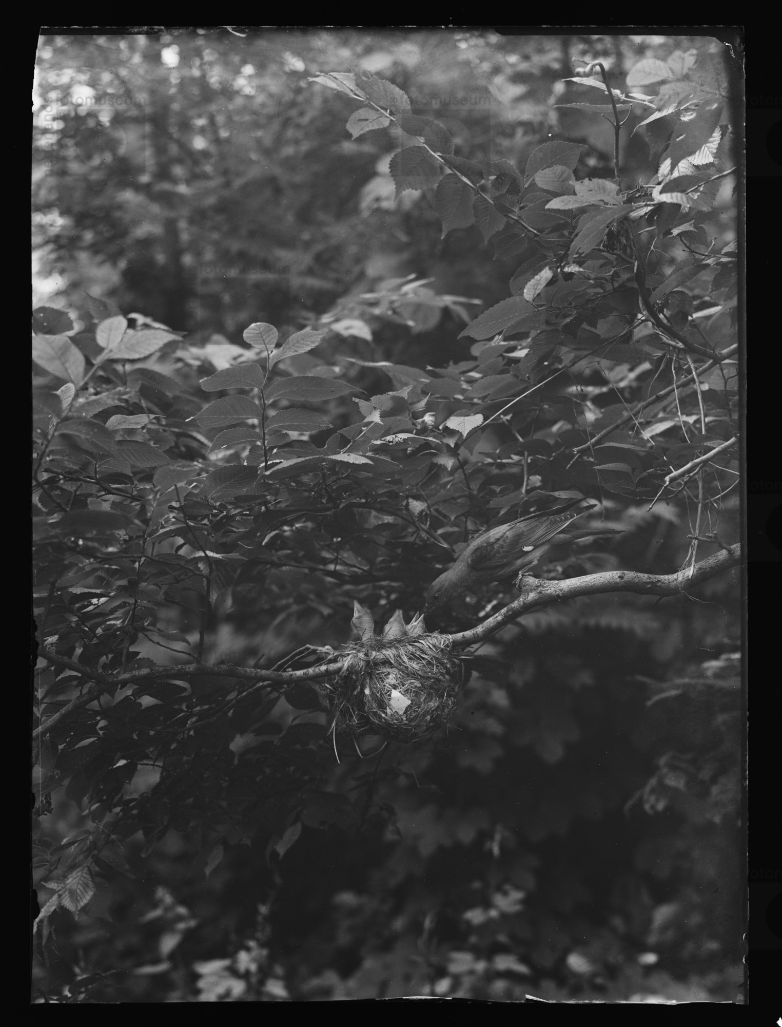 Vrouwtje Wielewaal voert jongen in nest, Egmond (1949)