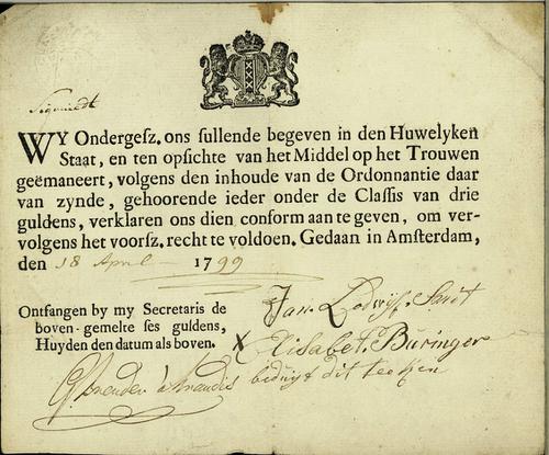 Huwelijksakte met klein zegel, 1799