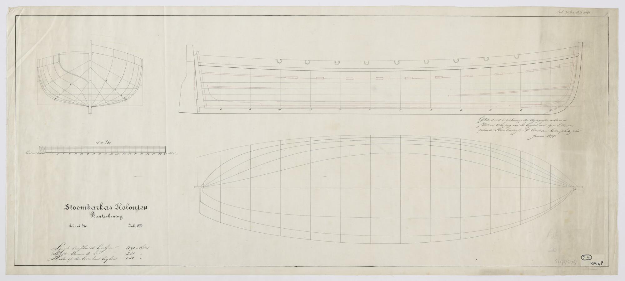 Lijnenplan, spantenraam van een stoombarkas met twee...
