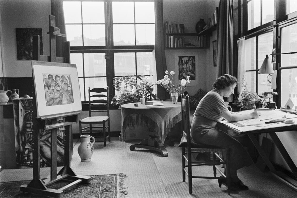 Fré Cohen aan haar werktafel in haar atelier in de K...