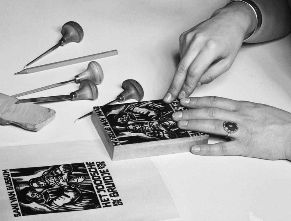 Fré Cohen maakt houtsnede voor boekomslag