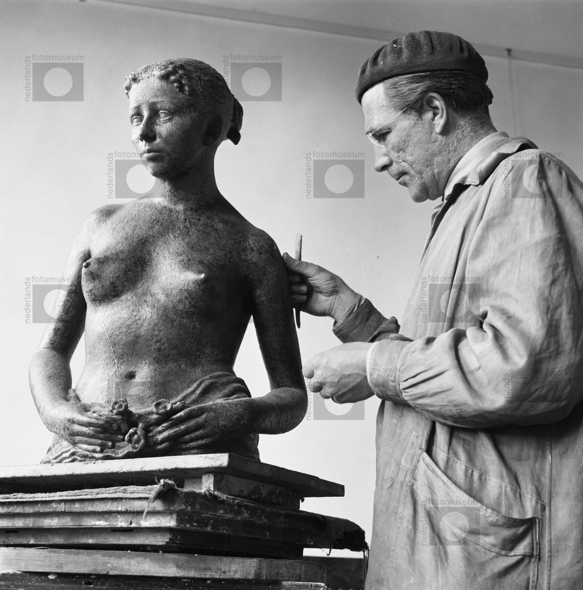 Beeldhouwer Piet Starreveld aan het werk in atelier,...