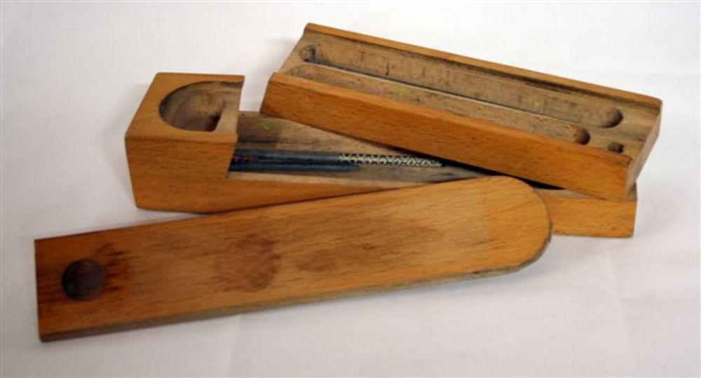griffeldoos. Langwerpig beukenhouten model met schui...