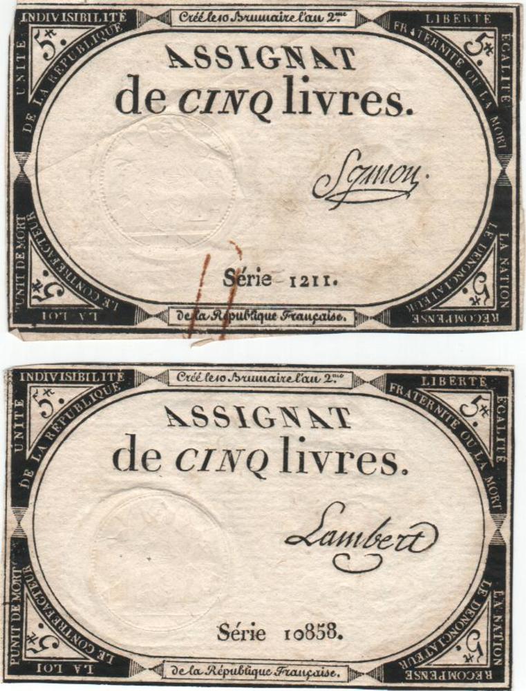 Assignat de cinq livres. Dun papier uitgegeven door ...