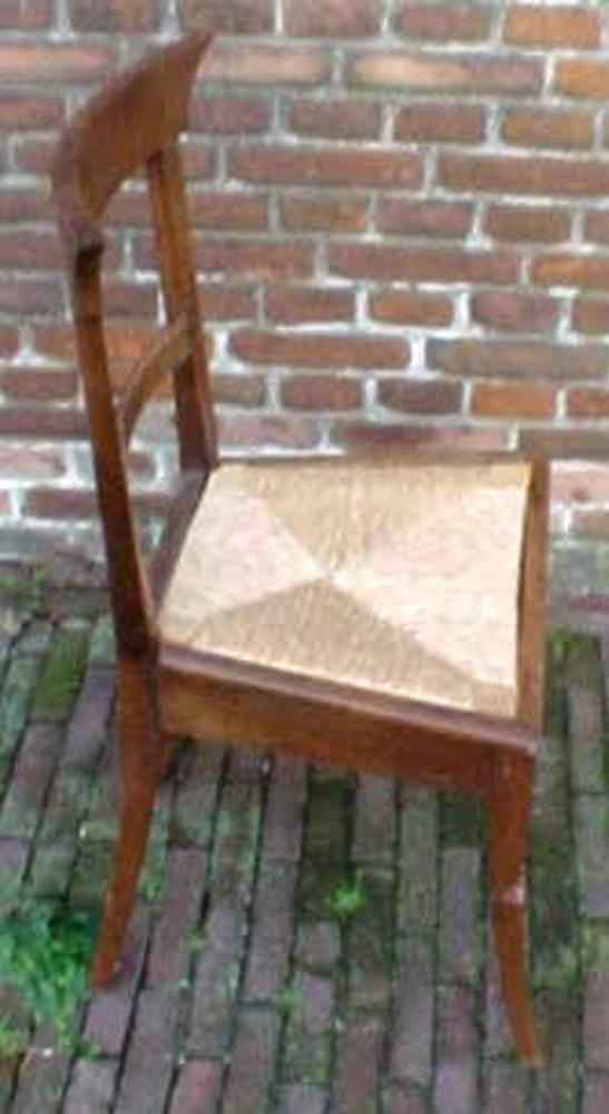 Stoel. Vier vierkante poten overgaand in rugraam. Af...