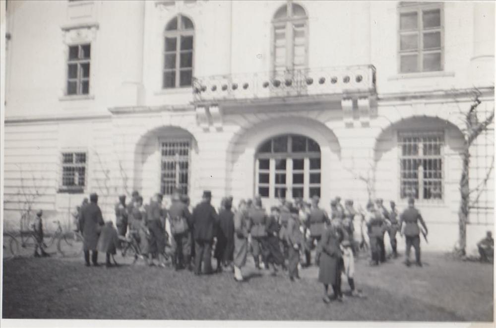 Foto van een Duits muziekcorps en toeschouwers voor ...