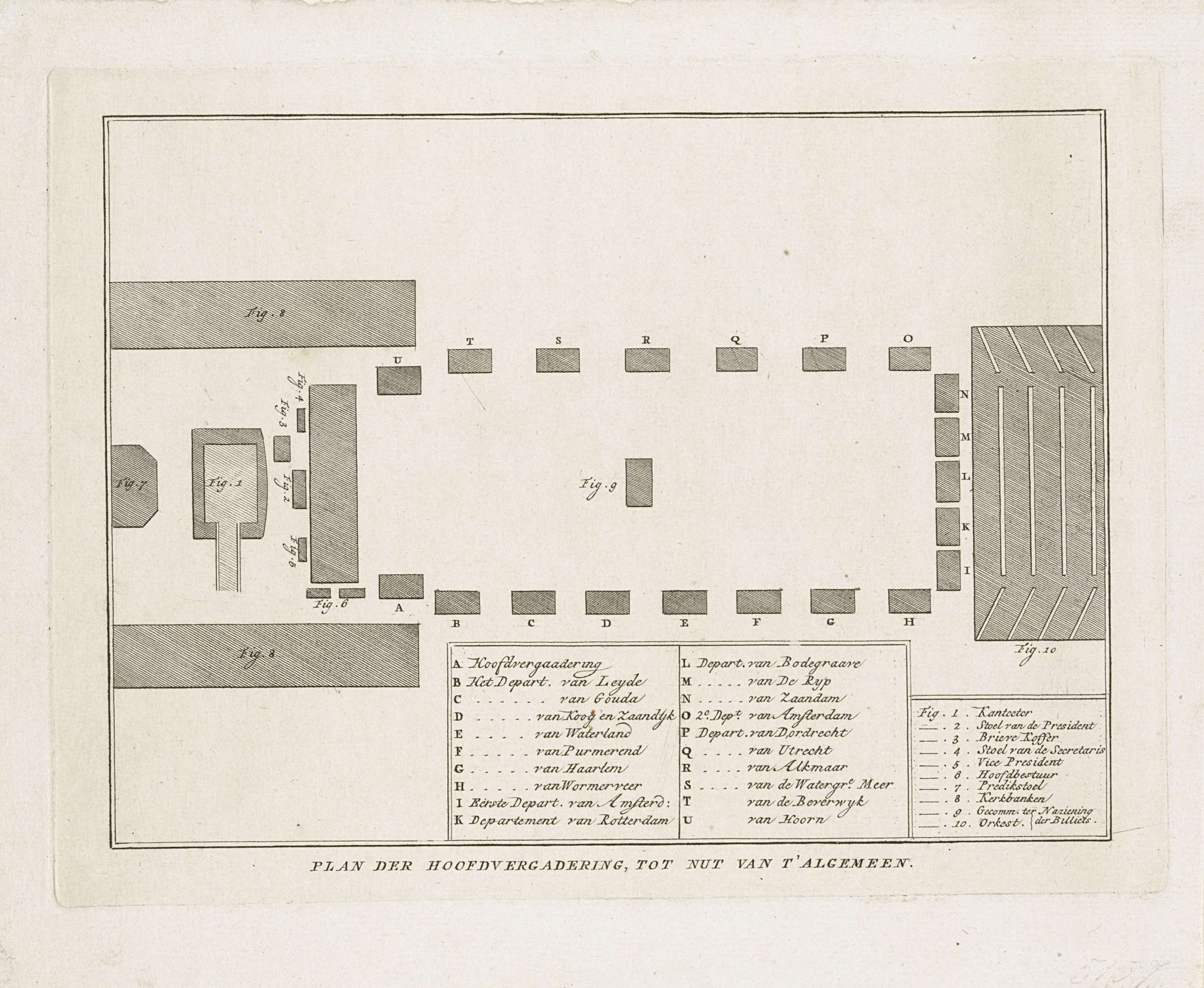 Plan met zitplaatsen voor een vergadering van de Maa...