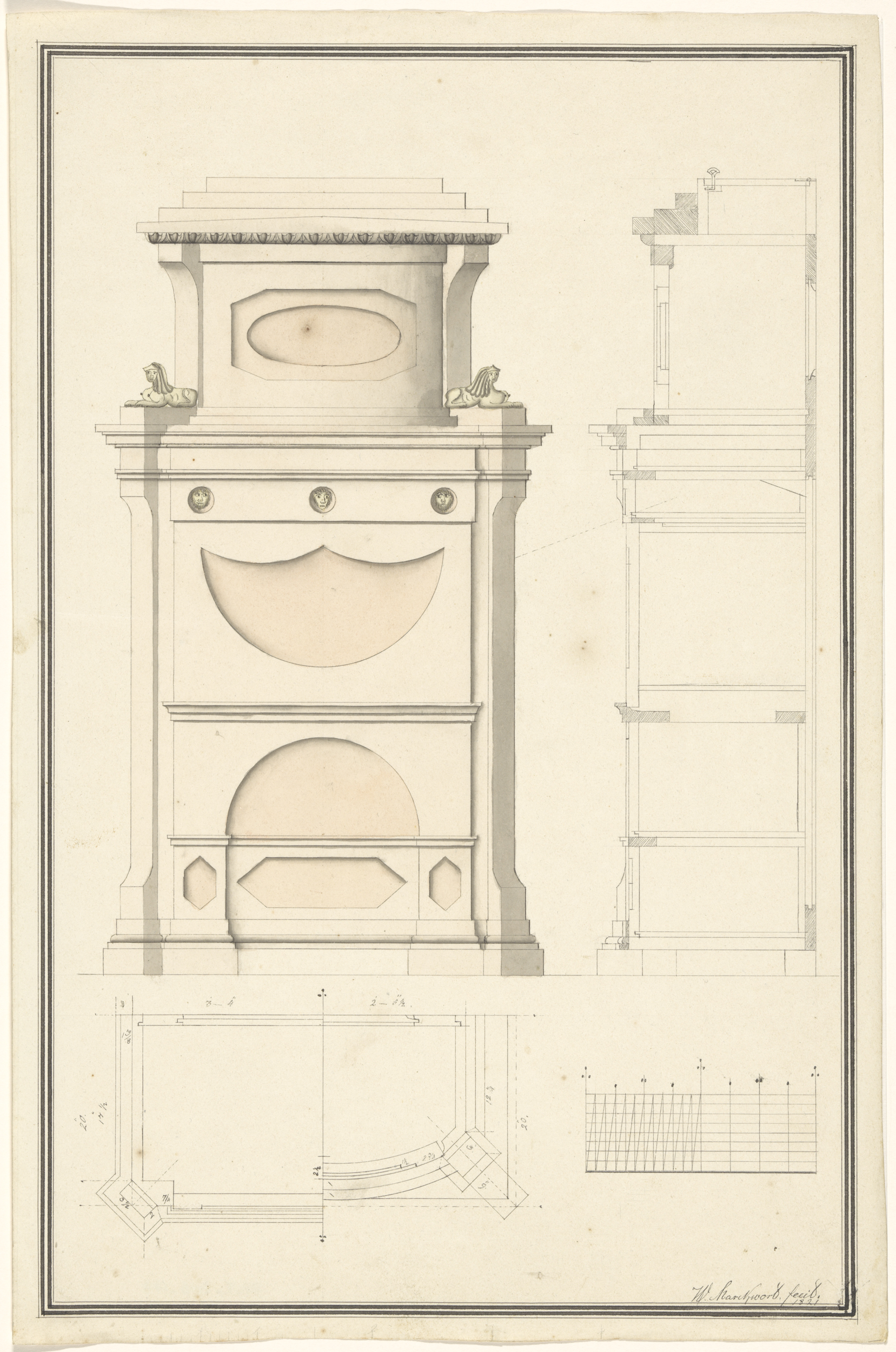 Spiegeltrumeau, voor- en zijaanzicht met daaronder d...