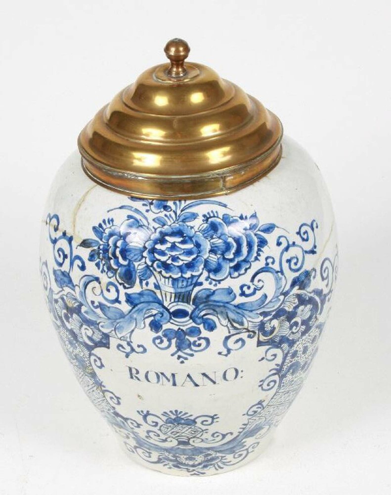 pot van Delfts blauw, koperen deksels ca. 1700