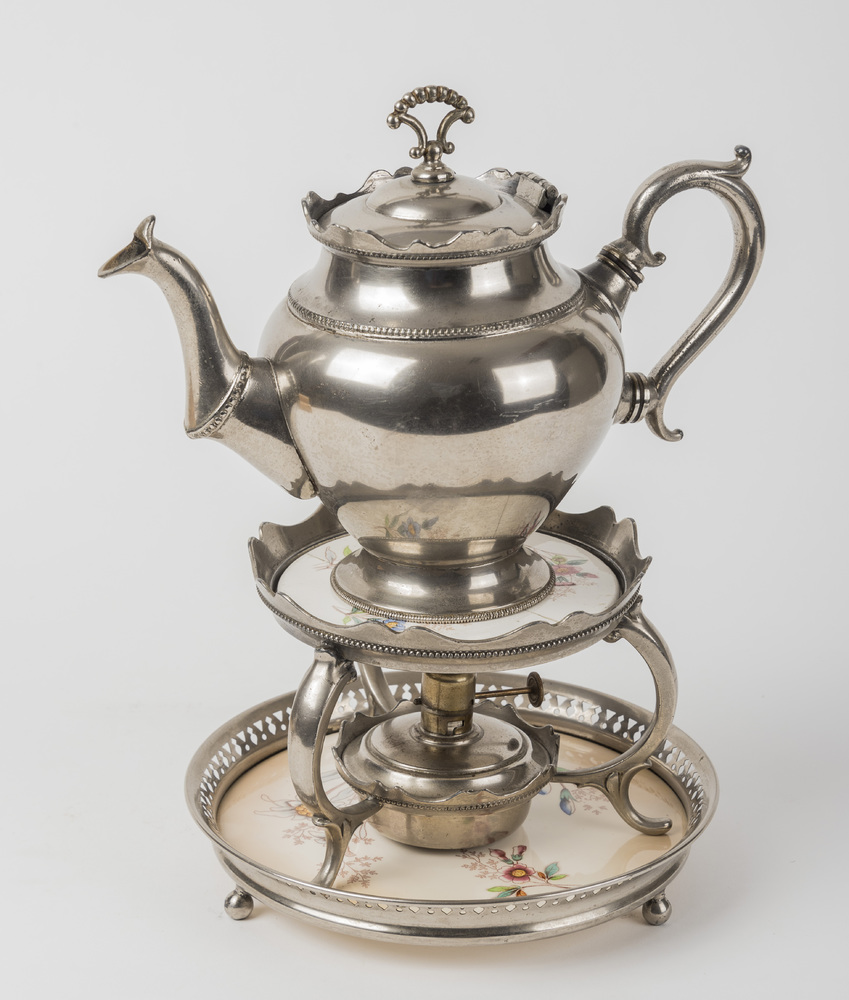 Theepot van alboïd, staande op een dienblad met comf...