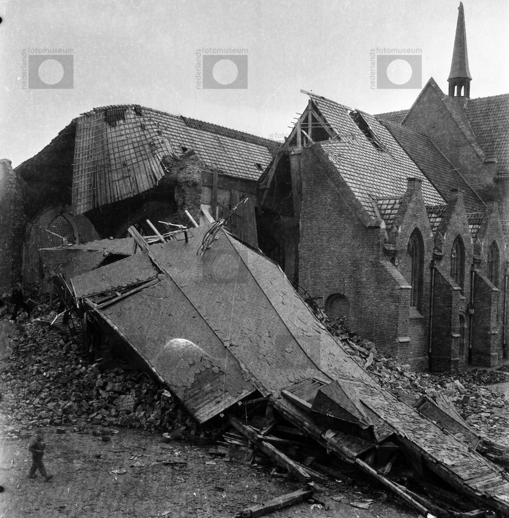 Oorlogsschade aan kerk en kerktoren van Wageningen (...