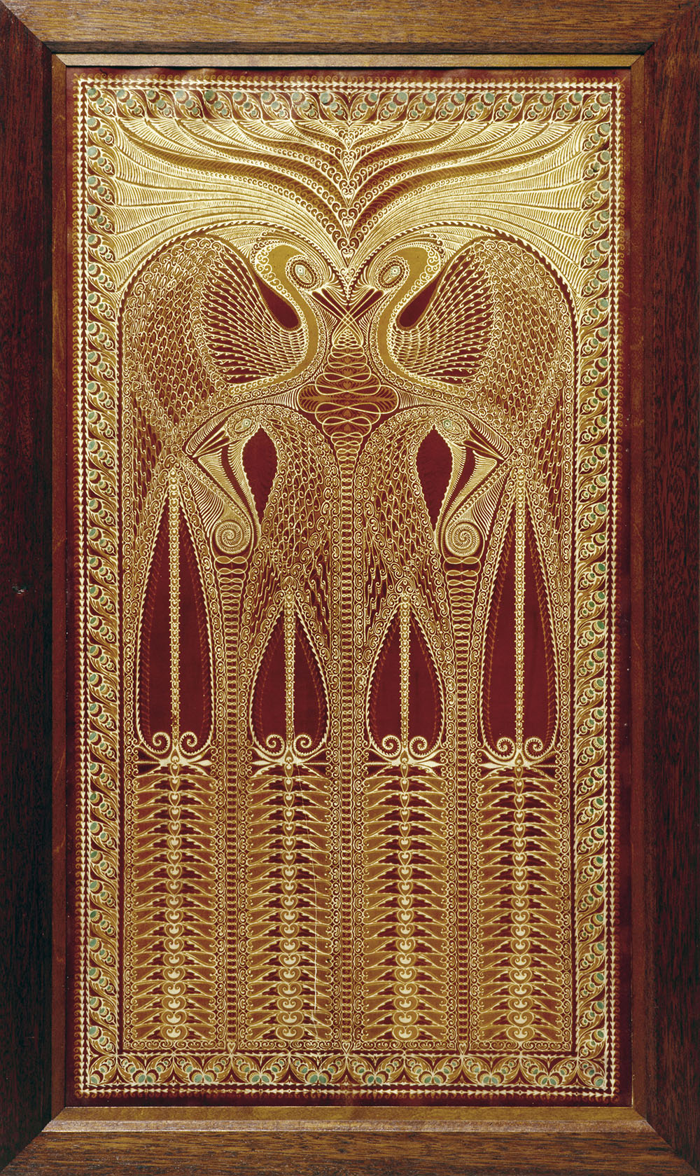 Paneel van een kamerscherm met gestileerde pauwen.