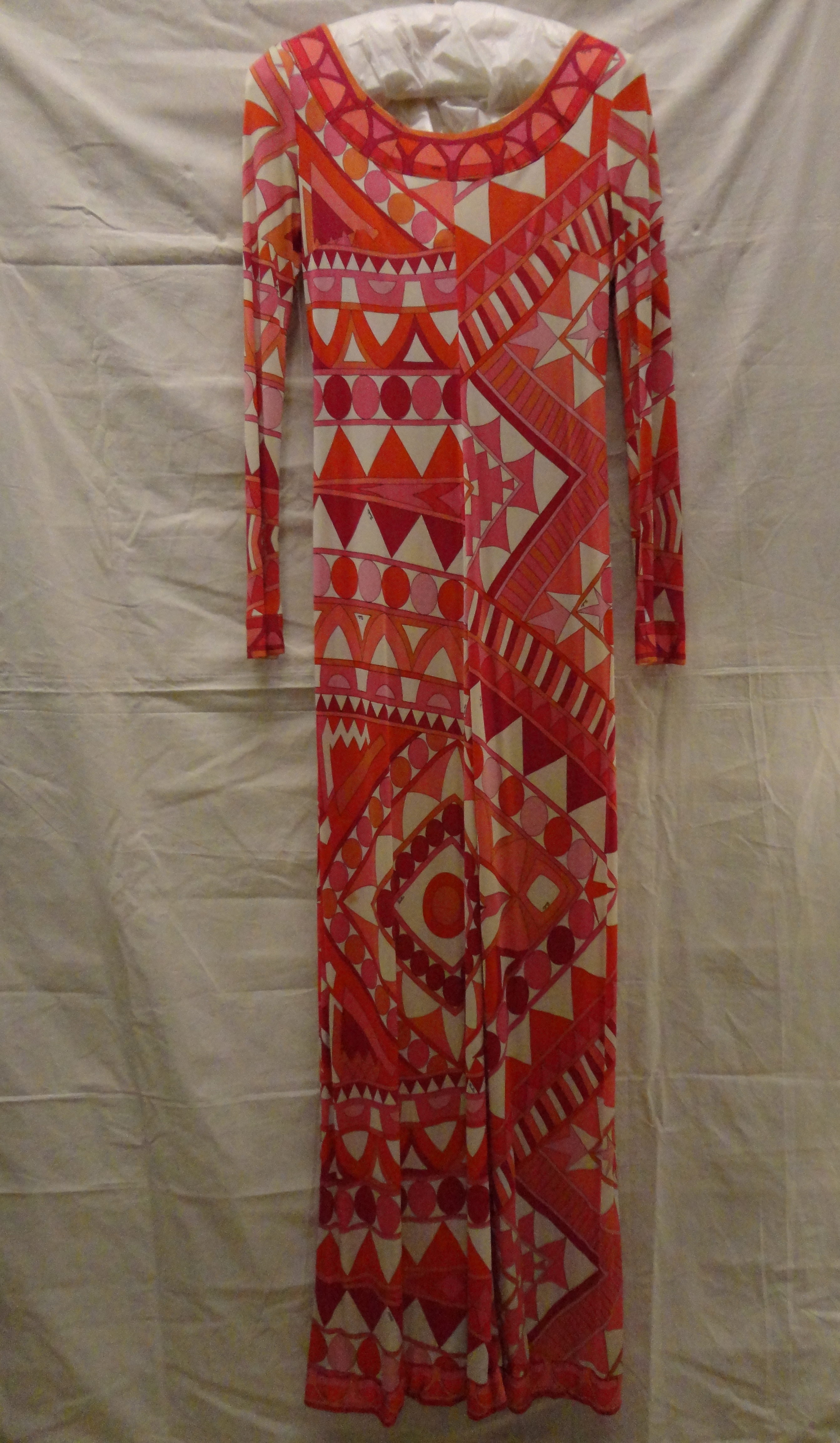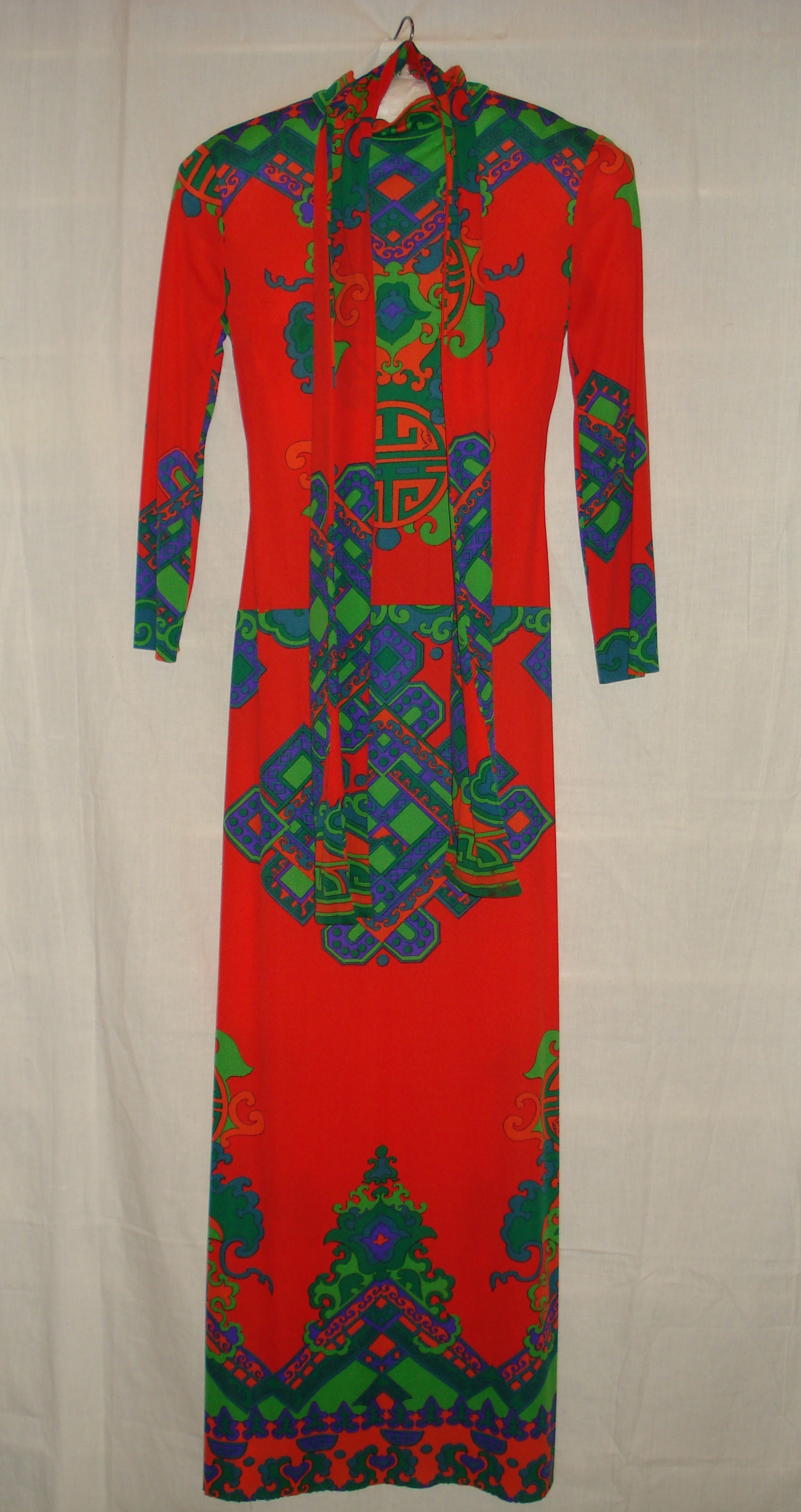 Jurk van rood polyamide tricot, bedrukt met patroon ...
