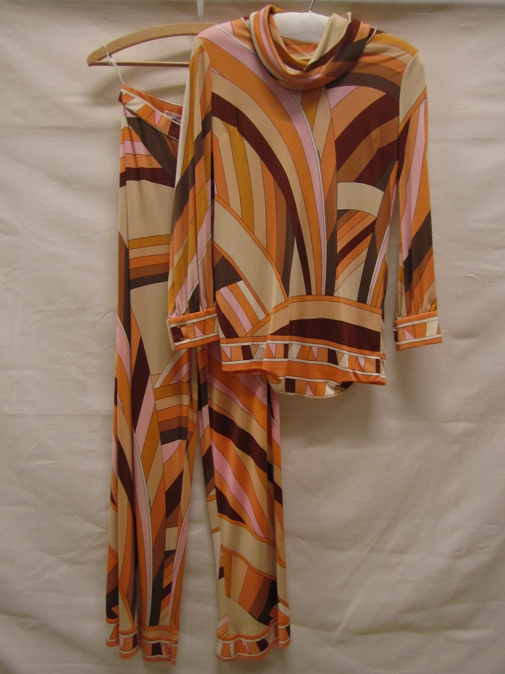 Broekpak van beige bedrukte zijden tricot met motief...