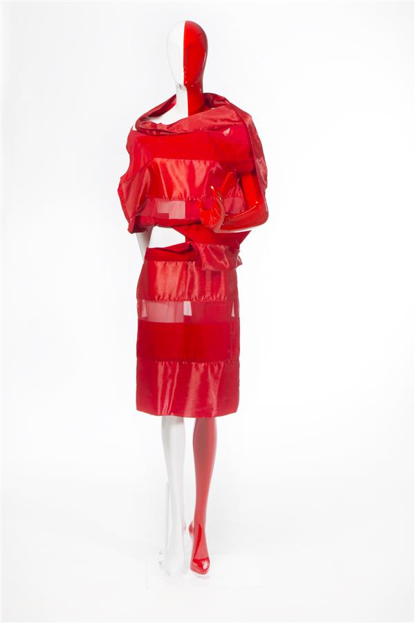 Ensemble, bestaande uit jurk van rood gestreept weef...