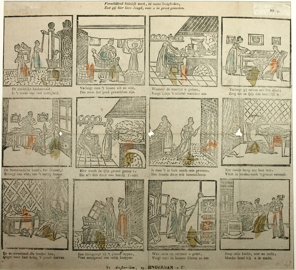 Centsprent met twaalf gekleurde prentjes over huisel...