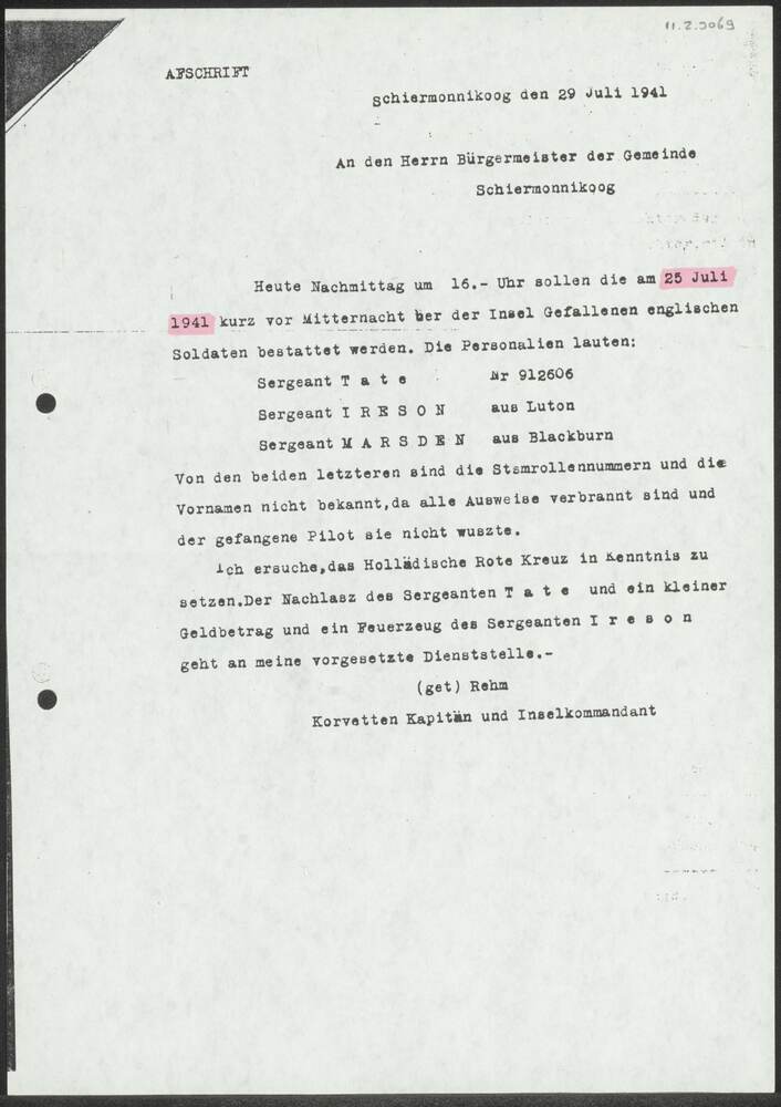 Schrijven van Korvetten Kapitän Rehm aan de Burgemee...