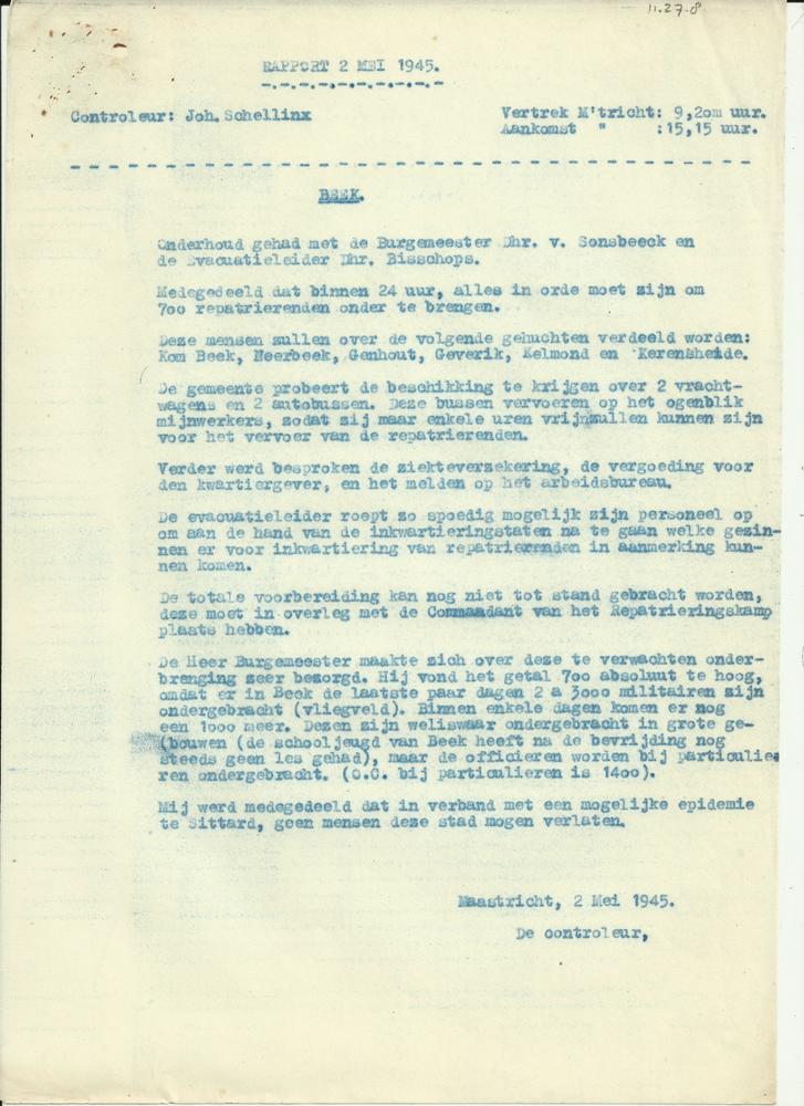 Rapport 2 mei 1945, bezoek aan Beek door J. Schellinx